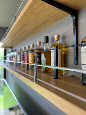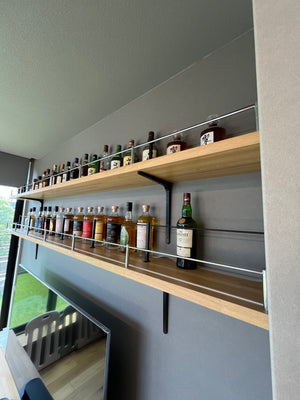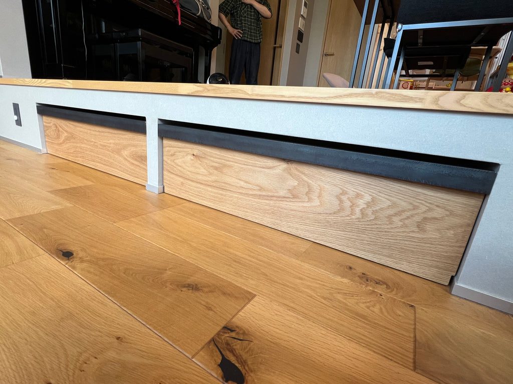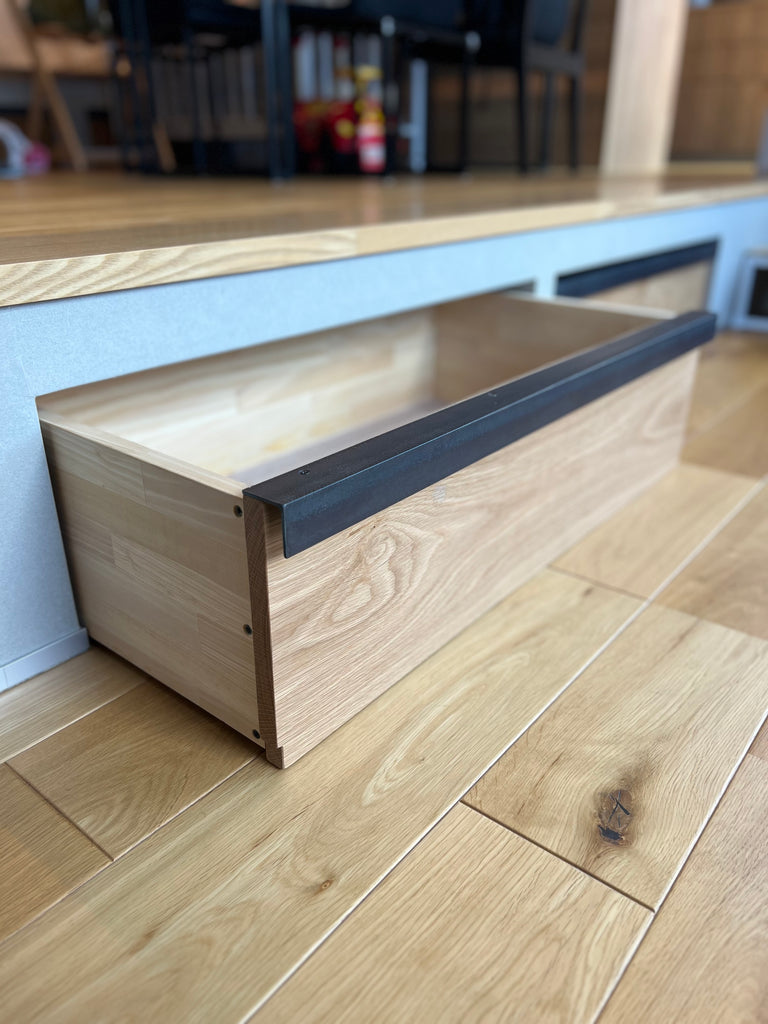 既存の飾り棚に追加のこぼれ止めをアイアンで製作、施工させていただきました。 また床下の開口部分を有効に使えるように引き出しを追加で製作もさせていただいております。 フルオーダーで既存のものに合わせての製作や施工も承っておりますのでお気軽にご相談くださいませ。 customer:大阪府 / Y様 item:アイアンこぼれ止め / 床下収納(引き出し) material:オーク / アイアン(黒皮鉄)