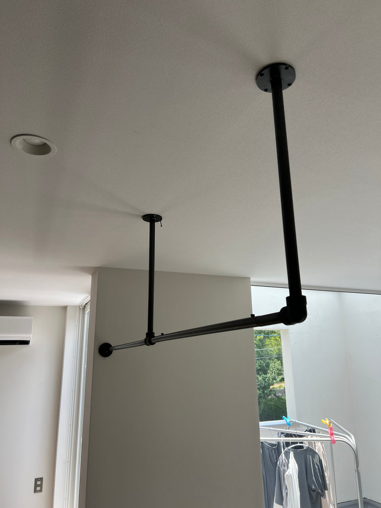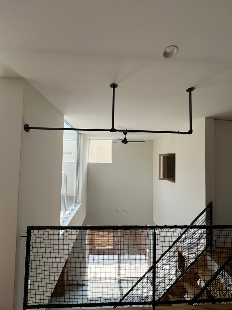 ご新築のタイミングに合わせてアイアンのハンガーパイプを数種類、製作施工させていただきました。 ウォークインクローゼット目一杯に3本と階段手すり上に1本、 1Fの窓の部分には植物をぶら下げて目隠しできるようにサイズを合わせて製作させていただきました。 丈夫なアイアン製なので、大量の洋服をかけても十分な耐久性があります。 ご希望サイズでの仕様、サイズにて製作可能です。 customer:大阪府 / S様 item:Hanger Pipe F / Hanger Pipe E / Hanger Pipe オーダー material:アイアン(黒皮鉄)