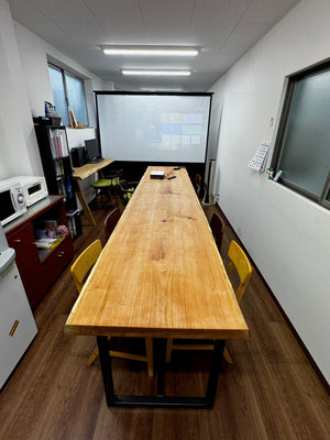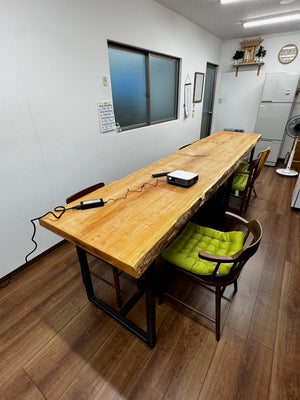製造業を営まれている工場のオフィスの休憩スペースにブラックチェリーの1枚板テーブルとダイニングチェアを納品させていただきました。 部屋が縦長の間取りなので、そのサイズに合わせて1枚板を選定。 未仕上げの状態でご注文いただき、仕上げは社長自らがやっておられました。 部屋のサイズに合った1枚板の選定や樹種のご提案もさせていただきますので、お気軽にお問い合わせください。 customer:大阪府 / 宮崎株式会社様 item:ブラックチェリー1枚板 / IR_LG_G(オーダー)/ Tansy Windsor Chair material:ブラックチェリー / アイアン(黒皮鉄)