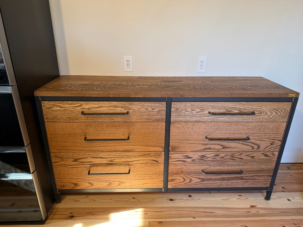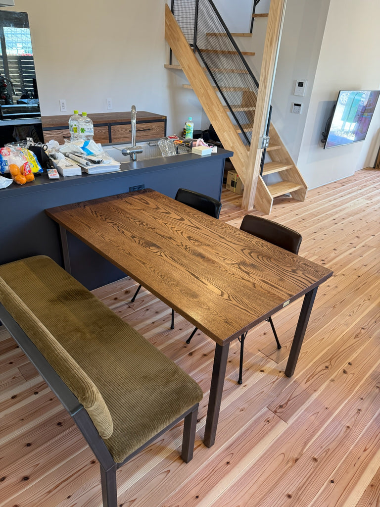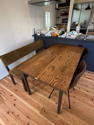 ご新築に合わせて家具を一式オーダーいただきました。 ご自宅の間取りに合わせて最適なサイズをご提案させていただきました。ほとんどの家具が細かなオーダーや仕様変更も可能となっております。 customer:大阪府 / T様 item:EMP Sofa 3S / Dining Table【IR_LG_D】/オーダーキッチンボード / S.T Cushion Bench《背もたれ付》 material:アイアン(黒皮鉄)/ オーク / コーデュロイ